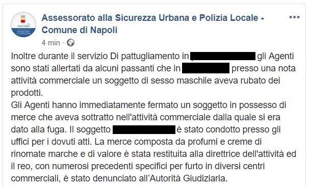 Questo quanto apprendiamo dalla pagina Fb della Polizia locale di Napoli.