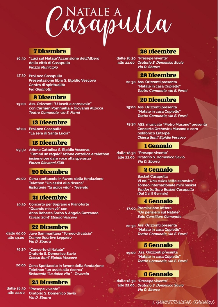 Pubblichiamo nota stampa del Comune di Casapulla: "‘Natale a Casapulla’: è questo il nome dato al cartellone di eventi organizzato dall’amministrazione comunale, diretta dal sindaco Renzo Lillo, in stretta collaborazione con le associazioni cittadine. Le iniziative saranno inaugurate domani 7 dicembre alle 16,30, con l’evento ‘Luci sul Natale’ con l’accensione dell’Albero della città di Casapulla in piazza Municipio. Fino al prossimo 2 gennaio - si legge nella nota -, grandi e piccoli potranno depositare il loro ‘Pensiero di Natale’ nella cassetta postale che sarà posizionata all’ingresso della casa comunale. Il 4 gennaio tutte le lettere saranno poste sull’Albero e le dieci migliori saranno premiate durante una manifestazione che si terrà nella sala consiliare. Sempre domani, organizzata dalla Pro loco locale, ci sarà la presentazione del libro Sant’Elpidio Vescovo presso il Centro di Spiritualità di via Giannotti. La Pro loco sarà protagonista anche de ‘La sera di Santa Lucia’, che si terrà il 13 dicembre alle 18. Dal giorno dell’Immacolata inizieranno gli eventi teatrali dell’associazione ‘Orizzonti’ con ‘U lascit e carnevale’ con Carmen Pommella e Giovanni Allocca. Il 28 e 29 dicembre e il 4 e 5 gennaio - si legge nella nota - andrà in scena ‘Natale in casa Cupiello’. Tutti gli spettacoli si terranno presso il Teatro comunale di via Fermi. Il 15 dicembre, l’Azione Cattolica Sant’Elpidio Vescovo, in collaborazione con Telethon, organizza l’iniziativa ‘Fammi un regalo. Insieme per dare voce alla speranza’ che si terrà in piazza Giovanni XXIII dalle 9,30. Il 20 e 22 dicembre ci sarà la cena spettacolo in favore della fondazione Telethon ‘Un assist alla ricerca’ presso il ristorante ‘La dolce vita’ di Teverola. Il 21 dicembre, alle 19,30, nella Chiesa di Sant’Elpidio Vescovo, si terrà il concerto per soprano e pianoforte ‘Quando m’en vò’ con Anna Roberta Sorbo e Angelo Gazzaneo; il giorno successivo si replica con il ‘Concerto di Natale’ dell’oratorio San Domenico Savio. Il 22 dicembre, presso il campo sportivo ‘Leggiero’ di via Sbarra ci sarà il Torneo di Calcio organizzato dalla Juve Sammaritana. Il 25 e 26 dicembre e il primo e 6 gennaio, in via Sbarra, sarà allestito il Presepe vivente dell’oratorio San Domenico Savio. Il 29 dicembre, nella chiesa di Sant’Elpidio - si legge nella nota -, l’associazione musicale ‘Pietro Musone’ presenta il ‘Concerto dell’Orchestra Musone e del Coro polifonico Euterpe’. Dal 2 al 5 gennaio ancora spazio allo sport con la sesta edizione di ‘Una calza sotto il canestro’, torneo internazionale di mini basket, che si terrà presso la Tendostruttura di via Kennedy. Soddisfatto per l’ottimo risultato raggiunto, il sindaco di Casapulla Renzo Lillo ha affermato: «Grazie alla sinergia con le associazioni cittadine, siamo riusciti a stilare un programma di eventi natalizi di tutto rispetto, che accompagnerà i cittadini per l’intero periodo di festività. In queste settimane, abbiamo avviato un rapporto di fattiva collaborazione anche con i tanti commercianti del nostro paese. A tal proposito siamo riusciti ad installare - si legge nella nota - le luminarie sia lungo la Nazionale Appia che nel centro storico. Ringrazio i componenti della mia maggioranza e il gruppo di ‘Casapulla al Centro’ che hanno lavorato tutti i giorni, anche fino a sera tarda, per rendere possibile la realizzazione del cartellone di eventi»."