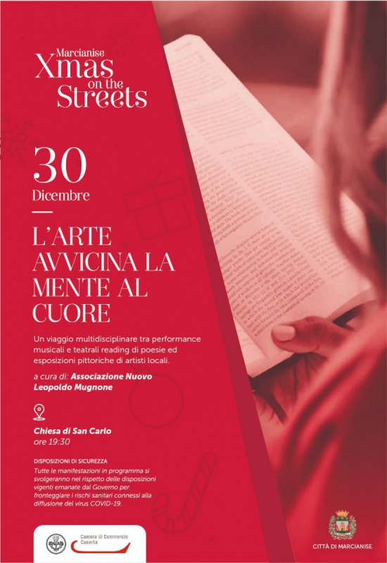 Questo quanto apprendiamo dalla pagina fb del Comune di Marcianise: "giovedì 30 dicembre alle ore 19.30, presso la Chiesa di San Carlo, l’associazione ‘Nuovo Leopoldo Mugnone’ presenterà ‘L’Arte avvicina la mente al cuore', un viaggio multidisciplinare tra performance musicali e teatrali, reading di poesie ed esposizioni pittoriche di artisti locali. La manifestazione è promossa dall’Amministrazione comunale guidata dal sindaco Antonello Velardi nell’ambito della sesta edizione di ‘Xmas on the Streets’. L'evento si svolgerà nel rispetto delle disposizioni emanate dal Governo per fronteggiare i rischi sanitari connessi alla diffusione del virus Covid-19."