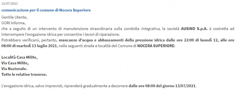 Lo apprendiamo dal sito web di Gori Acqua: "12/07/2021 comunicazione per il comune di Nocera Superiore Gentile Utente,GORI informa, che a seguito di un intervento di manutenzione straordinaria sulla condotta Integrativa, la società AUSINO S.p.A. è costretta ad interrompere l’erogazione idrica per consentire i lavori di riparazione. Potrebbero verificarsi - si legge nella nota - pertanto, mancanze d’acqua e abbassamenti della pressione idrica dalle ore 22:00 di lunedì 12, alle ore 08:00 di martedì 13 luglio 2021, nelle seguenti strade e località del Comune di NOCERA SUPERIORE: Località Casa Milite, Via Casa Milite, Via Nazionale. Tutte le relative traverse. L’erogazione idrica- si legge ancora - , salvo imprevisti, riprenderà gradualmente a decorrere dalle ore 08:00 del giorno 13/07/2021. Si segnala che alla riapertura del flusso idrico potrebbero verificarsi transitori fenomeni di torbidità dell’acqua, di breve durata, per i quali si consiglia di far scorrere - conclude la nota - per alcuni minuti l’acqua dai propri rubinetti. Ci scusiamo per il disagio".