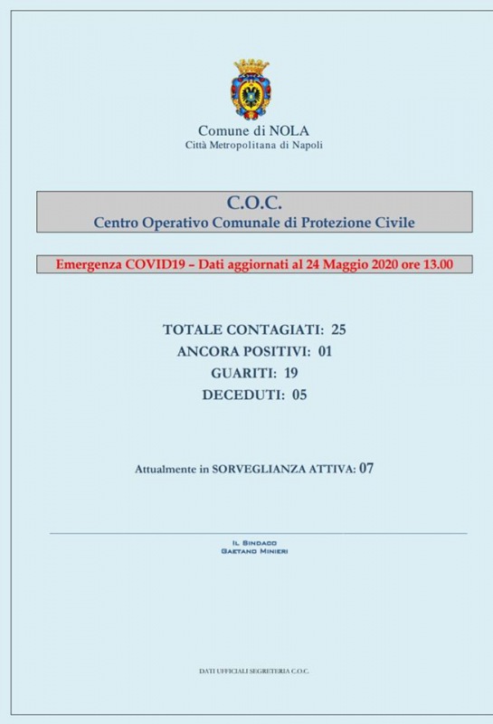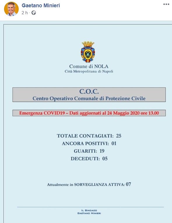 Questo quanto apprendiamo dalla pagina facebook del Sindaco Minieri: