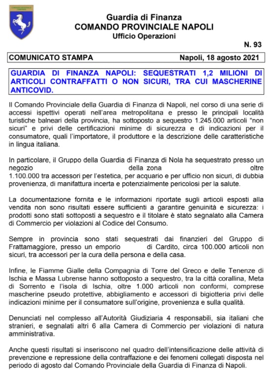 Pubblichiamo COMUNICATO STAMPA Guardia di Finanza COMANDO PROVINCIALE NAPOLI: "GUARDIA DI FINANZA NAPOLI: SEQUESTRATI 1,2 MILIONI DI ARTICOLI CONTRAFFATTI O NON SICURI, TRA CUI MASCHERINE ANTICOVID.