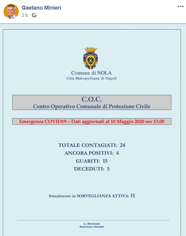 Questo quanto apprendiamo dalla pagina facebook del Sindaco Minieri:
