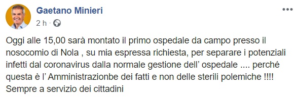 Questo quanto apprendiamo dalla pagina facebook del Sindaco Minieri: