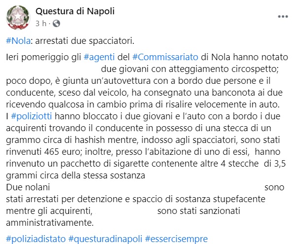 "#Nola: arrestati due spacciatori. Ieri pomeriggio gli #agenti del #Commissariato di Nola hanno notato ... due giovani con atteggiamento circospetto; poco dopo, è giunta un’autovettura con a bordo due persone e il conducente, sceso dal veicolo, ha consegnato- si legge nella nota- una banconota ai due ricevendo qualcosa in cambio prima di risalire velocemente in auto. I #poliziotti hanno bloccato i due giovani e l’auto con a bordo i due acquirenti trovando il conducente in possesso di una stecca di un grammo circa di hashish mentre, indosso agli spacciatori, sono stati rinvenuti 465 euro; inoltre, presso l’abitazione di uno di essi, hanno rinvenuto un pacchetto di sigarette contenente altre 4 stecche di 3,5 grammi circa della stessa sostanza Due nolani ... sono stati arrestati- si legge nella nota- per detenzione e spaccio di sostanza stupefacente mentre gli acquirenti, ... sono stati sanzionati amministrativamente."