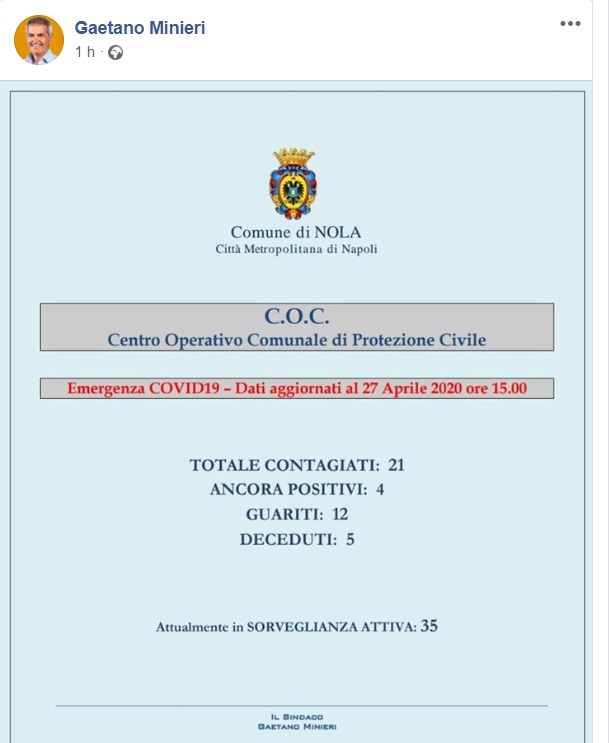Nola. H 18. La situazione dei contagi da Coronavirus al 27/04