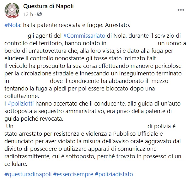 "Nola: ha la patente revocata e fugge. Arrestato. ... gli agenti del #Commissariato di Nola, durante il servizio di controllo del territorio, hanno notato in ... un uomo a bordo di un’autovettura che, alla loro vista, si è dato alla fuga per eludere il controllo nonostante gli fosse stato intimato l’alt. -Si legge nella nota- Il veicolo ha proseguito la sua corsa effettuando manovre pericolose per la circolazione stradale e innescando un inseguimento terminato in ... dove il conducente ha abbandonato il mezzo tentando la fuga a piedi per poi essere bloccato dopo una colluttazione. I #poliziotti hanno accertato che il conducente, alla guida di un’auto sottoposta a sequestro amministrativo, era privo della patente di guida poiché revocata. -Si legge nella nota- Un ... di polizia è stato arrestato per resistenza e violenza a Pubblico Ufficiale e denunciato per aver violato la misura dell’avviso orale aggravato dal divieto di possedere o utilizzare apparati di comunicazione radiotrasmittente, cui è sottoposto, perché trovato in possesso di un cellulare."