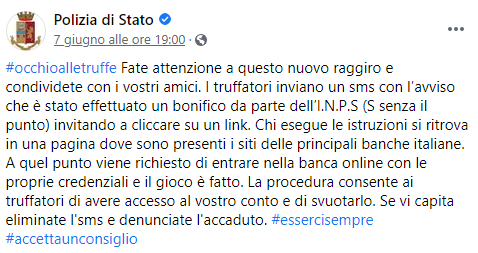 Questo il post pubblicato sulla pagina Facebook della Polizia di Stato: "Fate attenzione a questo nuovo raggiro e condividete con i vostri amici. I truffatori inviano un sms con l’avviso che è stato effettuato un bonifico da parte dell’I.N.P.S (S senza il punto) invitando a cliccare su un link. Chi esegue - si legge nel post - le istruzioni si ritrova in una pagina dove sono presenti i siti delle principali banche italiane. A quel punto viene richiesto di entrare nella banca online con le proprie credenziali e il gioco è fatto. La procedura - conclude il post - consente ai truffatori di avere accesso al vostro conto e di svuotarlo. Se vi capita eliminate l'sms e denunciate l'accaduto".