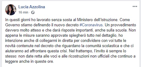 Questo quanto pubblicato dal Ministro dell'Istruzione Azzolina