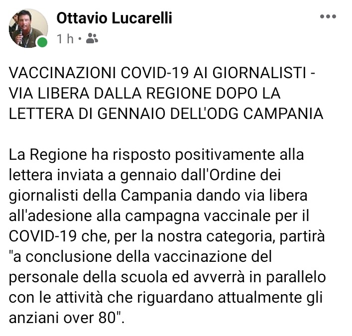 Questo il post pubblicato dal Presidente dell'Ordine dei giornalisti della Campania Ottavio Lucarelli: "Vaccinazioni Covd-19 ai giornalisti - Via libera della Regione dopo la lettera di gennaio dell'Odg Campania. La Regione - si legge nel post - ha risposto positivamente alla lettera inviata a gennaio dall'Ordine dei giornalisti della Campania dando via libera all'adesione alla campagna vaccinale per il COVID-19 che, per la nostra categoria, partirà "a conclusione della vaccinazione del personale della scuola ed avverrà in parallelo con le attività - conclude il post - che riguardano attualmente gli anziani over 80".