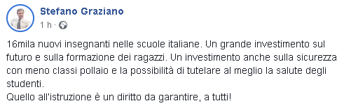 "16mila nuovi insegnanti nelle scuole italiane. Un grande investimento sul futuro e sulla formazione dei ragazzi. Un investimento anche sulla sicurezza con meno classi pollaio e la possibilità di tutelare al meglio la salute degli studenti.