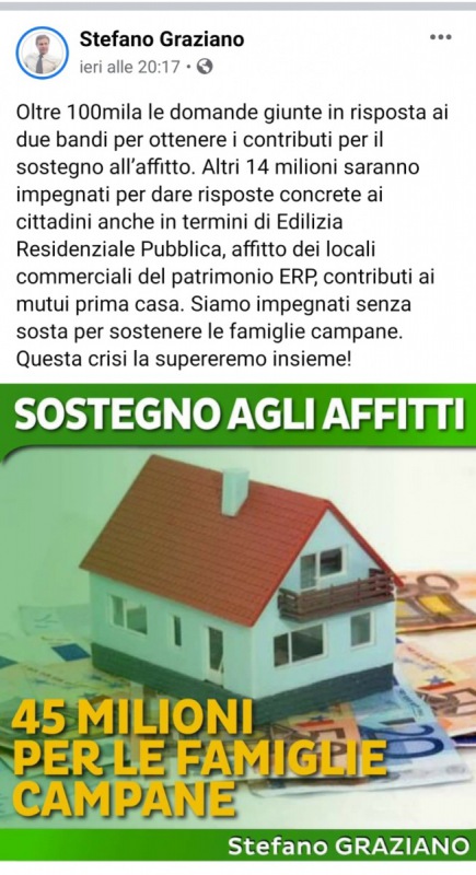 "Oltre 100mila le domande giunte in risposta ai due bandi per ottenere i contributi per il sostegno all’affitto. Altri 14 milioni saranno impegnati per dare risposte concrete ai cittadini anche in termini di Edilizia Residenziale Pubblica, affitto dei locali commerciali del patrimonio ERP, contributi ai mutui prima casa. Siamo impegnati senza sosta per sostenere le famiglie campane. Questa crisi la supereremo insieme!"