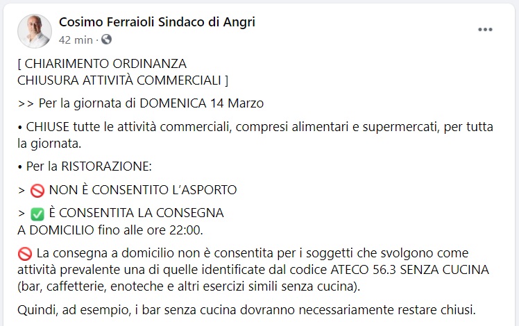 Questo quanto apprendiamo dalla pagina fb del Sindaco di Angri: "CHIARIMENTO ORDINANZA CHIUSURA ATTIVITÀ COMMERCIALI Per la giornata di DOMENICA 14 Marzo • CHIUSE tutte le attività commerciali, compresi alimentari e supermercati - si legge nella nota -, per tutta la giornata. • Per la RISTORAZIONE: NON È CONSENTITO L’ASPORTO È CONSENTITA LA CONSEGNA A DOMICILIO fino alle ore 22:00. La consegna a domicilio non è consentita per i soggetti che svolgono come attività prevalente una di quelle identificate dal codice ATECO 56.3 SENZA CUCINA - si legge nella nota - (bar, caffetterie, enoteche e altri esercizi simili senza cucina). Quindi, ad esempio, i bar senza cucina dovranno necessariamente restare chiusi."
