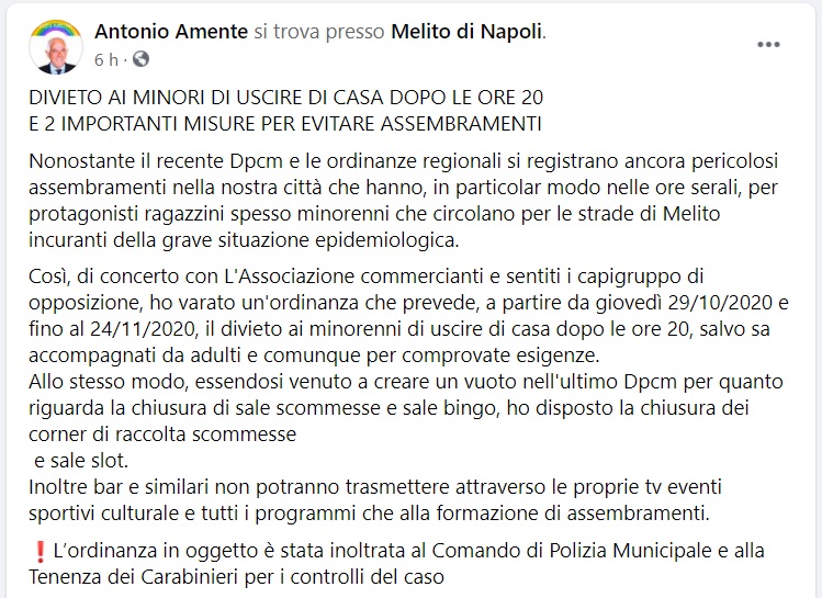 Questo quanto pubblicato sulla pagina facebook del Sindaco di Melito di Napoli