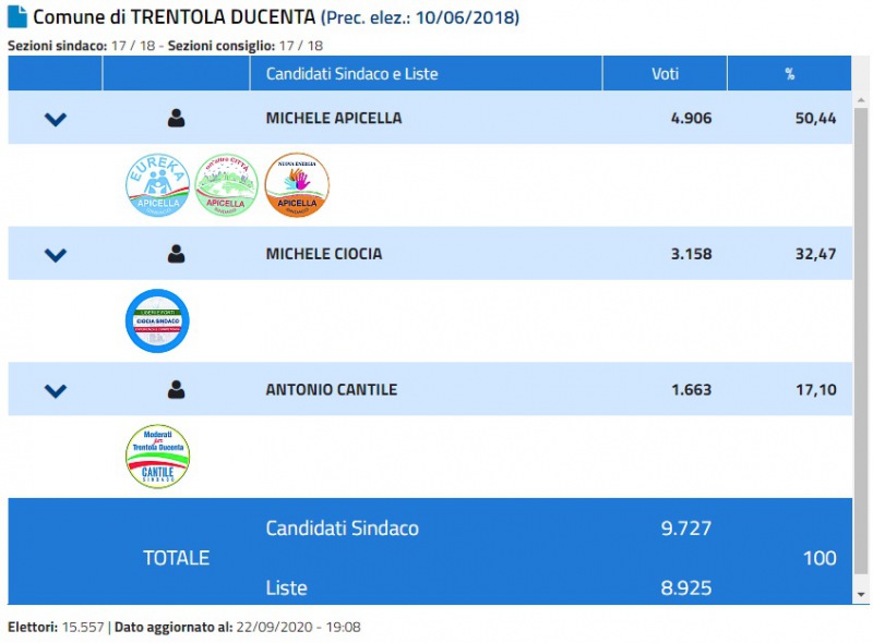 Questo l'aggiornamento sullo scrutinio delle Comunali a TRENTOLA DUCENTA sul sito del Ministero.