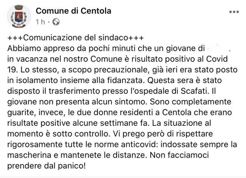 Questo quano pubblicato sulla pagina facebook del Comune di Centola