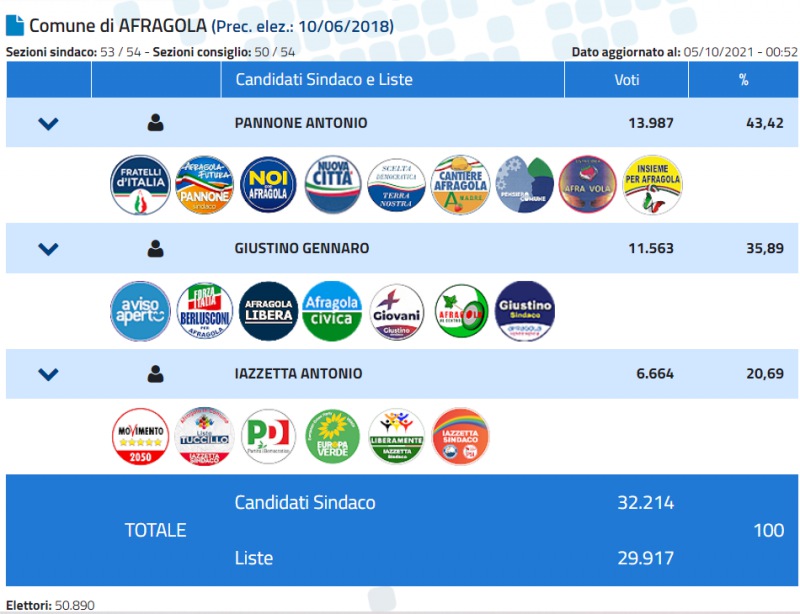 Manca praticamente solo l'ufficialità ma ci servirà il ballottaggio ad Afragola, per conoscere il nuovo cittadino, tra Antonio Pannone e Gennaro Giustino. Il primo ha dalla sua poco meno del 44% dei votanti, mentre Giustino, in vantaggio allo scrutinio della prima sezione, insegue col 35,89%.