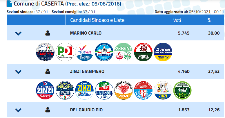 Marino avanti con il 38%, Zinzi che insegue con il 27,52%. I dati ufficiali del Ministero confermano la nostra anteprima. A Caserta si andrà al ballottaggio anche se, quasi certamente, con una forbice molto più stretta relativamente alla differenza di voti tra i due contendenti. Stabile il risultato di Del Gaudio che si attesta intorno al 12%. Sarà lui, insieme a Vignola (Speranza per Caserta, Io firmo per Caserta e Per) a fare da pendolo delle sorti del futuro amministrativo della città capoluogo, al ballottaggio che si terrà domenica 17 e lunedì 18 ottobre. Di seguito i dati del Ministero dell'Interno.
