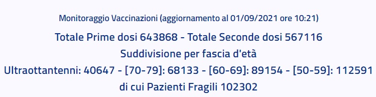 Questo quanto apprendiamo dall'ASL Caserta: "Monitoraggio Vaccinazioni (aggiornamento al 01/09/2021 ore 10:21) Totale Prime dosi 643868 - Totale Seconde dosi 567116 Suddivisione per fascia d'età Ultraottantenni: 40647 - [70-79]: 68133 - [60-69]: 89154 - [50-59]: 112591 di cui Pazienti Fragili 102302"