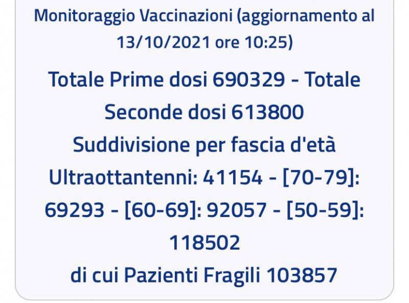 Questo quanto apprendiamo dall'ASL CE: "Monitoraggio Vaccinazioni (aggiornamento al 13/10/2021 ore 10:25) Totale Prime dosi 690329 - Totale Seconde dosi 613800 Suddivisione per fascia d'età Ultraottantenni: 41154 - [70-79]: 69293 - [60-69]: 92057 - [50-59]: 118502 di cui Pazienti Fragili 103857"