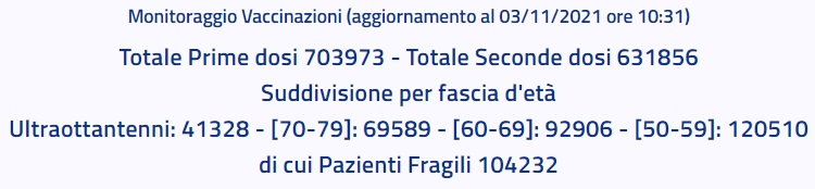 Questo quanto apprendiamo dall'ASL CE: "Monitoraggio Vaccinazioni (aggiornamento al 03/11/2021 ore 10:31) Totale Prime dosi 703973 - Totale Seconde dosi 631856 Suddivisione per fascia d'età Ultraottantenni: 41328 - [70-79]: 69589 - [60-69]: 92906 - [50-59]: 120510 di cui Pazienti Fragili 104232".