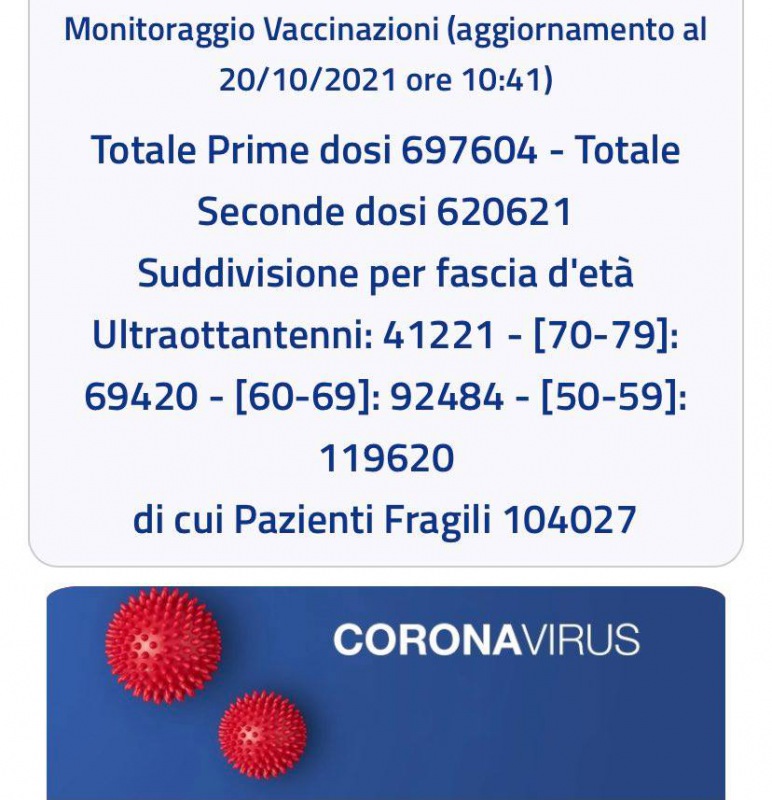Questo quanto apprendiamo dall'ASL CE: "Monitoraggio Vaccinazioni (aggiornamento al 20/10/2021 ore 10:41) Totale Prime dosi 697604 - Totale Seconde dosi 620621 Suddivisione per fascia d'età Ultraottantenni: 41221 - [70-79]: 69420 - [60-69]: 92484 - [50-59]: 119620 di cui Pazienti Fragili 104027"