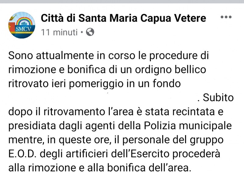 "Sono attualmente in corso le procedure di rimozione e bonifica di un ordigno bellico ritrovato ieri pomeriggio in un fondo...Subito dopo il ritrovamento l’area è stata recintata e presidiata dagli agenti della Polizia municipale mentre, in queste ore, il personale del gruppo E.O.D. degli artificieri dell’Esercito procederà alla rimozione e alla bonifica dell’area."