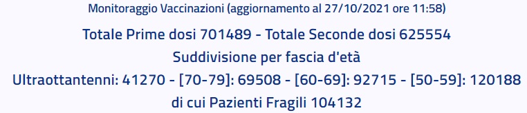 Questo quanto apprendiamo dall'ASL CE: "Monitoraggio Vaccinazioni (aggiornamento al 27/10/2021 ore 11:58) Totale Prime dosi 701489 - Totale Seconde dosi 625554 Suddivisione per fascia d'età Ultraottantenni: 41270 - [70-79]: 69508 - [60-69]: 92715 - [50-59]: 120188 di cui Pazienti Fragili 104132"