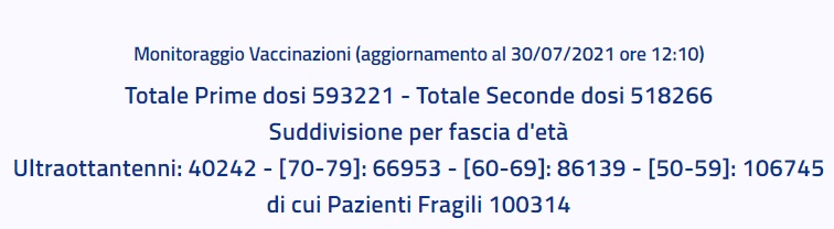 Questo quanto apprendiamo dall'ASL Caserta: "Monitoraggio Vaccinazioni (aggiornamento al 30/07/2021 ore 12:10) Totale Prime dosi 593221 - Totale Seconde dosi 518266 Suddivisione per fascia d'età Ultraottantenni: 40242 - [70-79]: 66953 - [60-69]: 86139 - [50-59]: 106745 di cui Pazienti Fragili 100314"