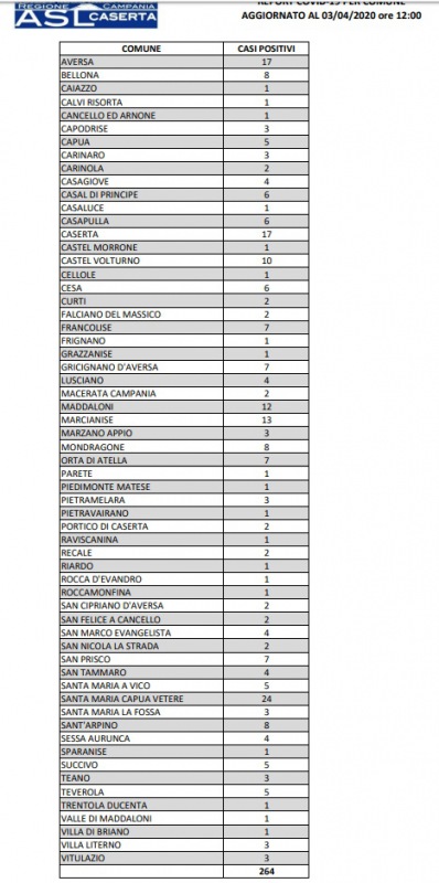 Questo il dato dei contagiati da Coronavirus emanato dall'ASL Caserta in Provincia, suddiviso Comune per Comune
