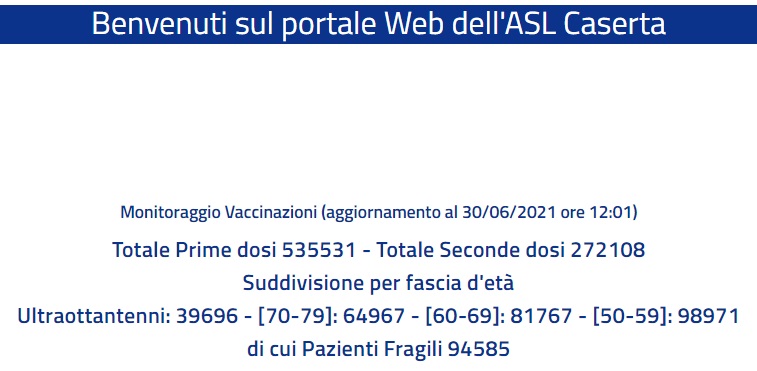 Ore 12. Vaccinazioni Asl Ce. Somministrate 535.531 prime dosi