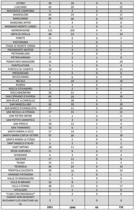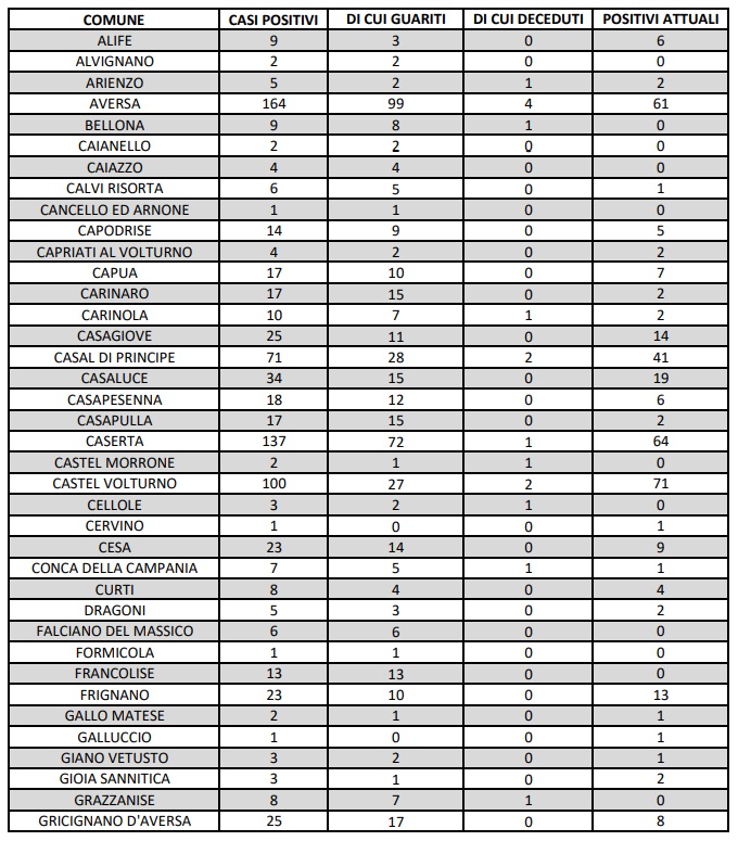 Ore 13. 29/9. Agg. Coronavirus Prov. CE. 17 NUOVI POSITIVI. Dati ASL Comune per Comune