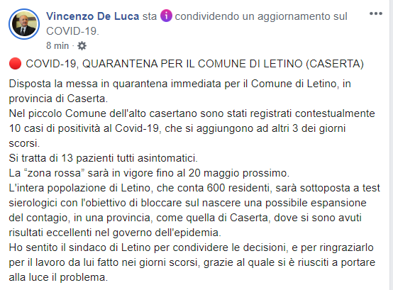 Questo il post pubblicato su Facebook dal Presidente della Regione Campania Vincenzo De Luca:
