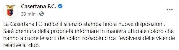 Questo quanto pubblicato sulla pagina fb della Casertana: "La Casertana FC indice il silenzio stampa fino a nuove disposizioni. Sarà premura della proprietà - si legge nella nota - informare in maniera ufficiale coloro che hanno a cuore le sorti dei colori rossoblu circa l’evolversi delle vicende relative al club."