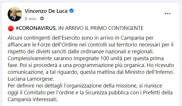Questo quanto comunicato sulla pagina Fb dal Governatore De Luca