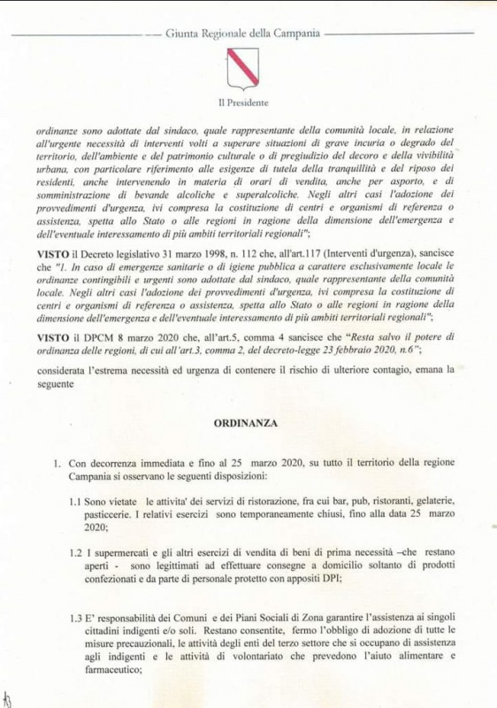 Questa l'ordinanza della Regione Campania in merito alla possibilità per i supermercati di fare consegne a domicilio