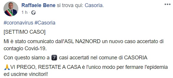 Questo quanto apprendiamo dalla pagina facebook del Sindaco Bene: