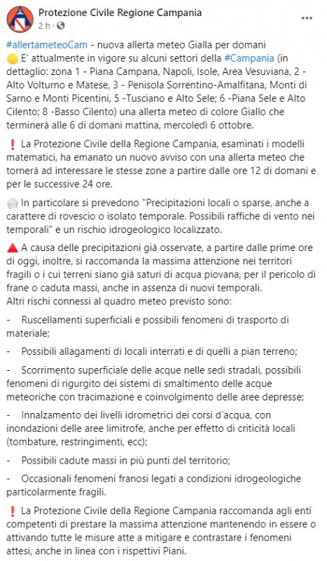 "#allertameteoCam - nuova allerta meteo Gialla per domani. E' attualmente in vigore su alcuni settori della #Campania (in dettaglio: zona 1 - Piana Campana, Napoli, Isole, Area Vesuviana, 2 - Alto Volturno e Matese, 3 - Penisola Sorrentino-Amalfitana, Monti di Sarno e Monti Picentini, 5 -Tusciano e Alto Sele; 6 -Piana Sele e Alto Cilento; 8 -Basso Cilento) una allerta meteo di colore Giallo che terminerà alle 6 di domani mattina, mercoledì 6 ottobre. La Protezione Civile della Regione Campania, esaminati i modelli matematici, ha emanato- si legge nella nota- un nuovo avviso con una allerta meteo che tornerà ad interessare le stesse zone a partire dalle ore 12 di domani e per le successive 24 ore. In particolare si prevedono "Precipitazioni locali o sparse, anche a carattere di rovescio o isolato temporale. Possibili raffiche di vento nei temporali" e un rischio idrogeologico localizzato. A causa delle precipitazioni già osservate, a partire dalle prime ore di oggi, inoltre, si raccomanda la massima attenzione nei territori fragili o i cui terreni siano già saturi di acqua piovana, per il pericolo di frane o caduta massi, anche in assenza di nuovi temporali. Altri rischi connessi al quadro meteo previsto sono: - Ruscellamenti superficiali e possibili fenomeni di trasporto di materiale; - Possibili allagamenti di locali interrati e di quelli a pian terreno; - Scorrimento superficiale delle acque nelle sedi stradali, possibili fenomeni di rigurgito dei sistemi di smaltimento delle acque meteoriche con tracimazione e coinvolgimento delle aree depresse; - Innalzamento dei livelli idrometrici dei corsi d’acqua, con inondazioni delle aree limitrofe, anche per effetto- si legge nella nota- di criticità locali (tombature, restringimenti, ecc); - Possibili cadute massi in più punti del territorio; - Occasionali fenomeni franosi legati a condizioni idrogeologiche particolarmente fragili. La Protezione Civile della Regione Campania raccomanda agli enti competenti di prestare la massima attenzione mantenendo in essere o attivando tutte le misure atte a mitigare e contrastare i fenomeni attesi, anche in linea con i rispettivi Piani."