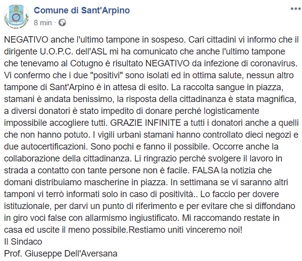 Questo quanto apprendiamo dalla pagina facebook del Comune di Sant'Arpino: