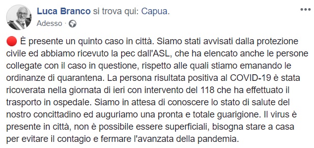 Questo qunato apprendiamo dalla pagina facebook del Sindaco Branco: