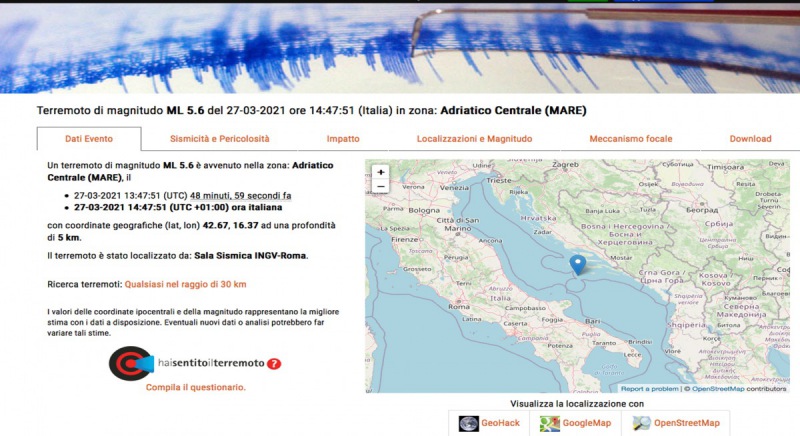 "Un terremoto di magnitudo ML 5.6 è avvenuto nella zona: Adriatico Centrale (MARE), il