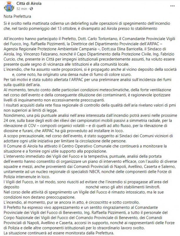 Questo quanto apprendiamo dalla pagina fb del Comune di Airola: "Nota Prefettura Si è svolto nella mattinata odierna un debriefing sulle operazioni di spegnimento dell’incendio che, nel tardo pomeriggio del 13 ottobre, è divampato ad Airola presso lo stabilimento ... All’incontro hanno partecipato il Prefetto, Dott. Carlo Torlontano, il Comandante Provinciale Vigili del Fuoco, Ing. Raffaella Pizzimenti, la Direttrice del Dipartimento Provinciale dell’ARPAC – Agenzia Regionale Protezione Ambientale Campania –, Dott.ssa Elina Barricella, il Sindaco di Airola, Ing. Vincenzo Falzarano, nonché il Capo Dipartimento della Protezione Civile, Ing. Fabrizio Curcio, che - si legge nella nota -, presente in Città per impegni istituzionali precedentemente assunti, ha voluto essere presente quale segno di vicinanza alle Istituzioni e alla comunità locale. L’incendio, che ha assunto vaste proporzioni, si è propagato anche al vicino deposito della società ... e, come noto, ha originato una densa nube di fumo di colore scuro. Per tali motivi è stata subito allertata l’ARPAC per una preliminare analisi sull’incidenza dei fumi sulla qualità dell’aria. Al momento, tenuto conto delle particolari condizioni meteoclimatiche, della forte ventilazione nel corso dell’evento e della conseguente diluizione dei contaminanti, è ragionevole ipotizzare livelli di inquinamento non eccessivamente preoccupanti. I risultati acquisiti dalla rete fissa regionale di controllo della qualità dell’aria rivelano valori di pmi non superiori ai limiti di legge. Nondimeno, una più puntuale analisi nell’area interessata dall’incendio potrà aversi nelle prossime 24 ore, sulla base degli esiti dei rilievi dei campionatori mobili passivi a simmetria radiale, per la rilevazione di COV – composti organici volatili – e di quelli ad alto flusso - si legge nella nota -, per la rilevazione di diossine e furani, che ARPAC ha già provveduto ad installare in loco. A scopo precauzionale, nel corso dell’evento, è stato suggerito ai Sindaci dei Comuni viciniori di adottare ogni utile iniziativa per limitare la circolazione delle persone. Il Comune di Airola ha attivato il Centro Operativo Comunale che continuerà a monitorare la situazione e a fornire ogni utile supporto alla popolazione. L’intervento immediato dei Vigili del Fuoco e la tempestiva, puntuale, analisi della portata dell’evento hanno consentito di organizzare un piano di intervento efficace, con l’ausilio di diverse squadre e mezzi, anche provenienti dai Comandi Provinciali di Napoli, Avellino, Caserta e Salerno, unitamente ad un nucleo regionale di specialisti NBCR, nonché delle componenti delle Forze di Polizia intervenute in loco. I Vigili del Fuoco, in tal modo, sono riusciti ad evitare che l’incendio si propagasse all’area del deposito ... nonché verso gli altri stabilimenti limitrofi. Nel corso delle attività di spegnimento un Vigile del Fuoco è rimasto intossicato, ma le sue condizioni non destano preoccupazione. L’incendio, al momento, pur se ancora in atto, è circoscritto e sotto controllo. Il Prefetto ha espresso vivo apprezzamento e un sentito ringraziamento al Comandante Provinciale dei Vigili del Fuoco di Benevento, Ing. Raffaella Pizzimenti, a tutto il personale del Corpo Nazionale dei Vigili del Fuoco del Comando Provinciale di Benevento, dei Comandi Provinciali di Napoli, Avellino e Caserta, accorsi in supporto, nonché ai rappresentanti delle Forze di Polizia e delle altre componenti istituzionali - si legge nella nota - per lo straordinario lavoro svolto. La situazione continuerà ad essere monitorata dalla Prefettura".