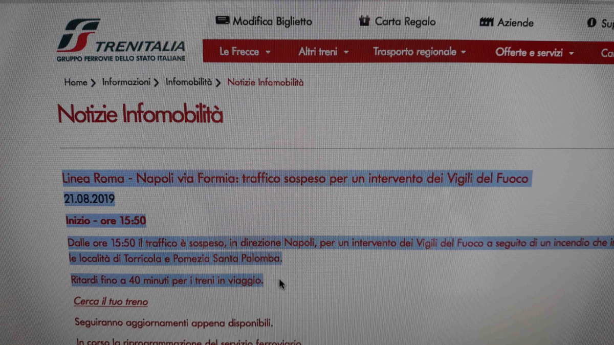 Dalle ore 15:50 il traffico è sospeso, in direzione Napoli, per un intervento dei Vigili del Fuoco a seguito di un incendio che interessa la linea ferroviaria tra le località di Torricola e Pomezia Santa Palomba.