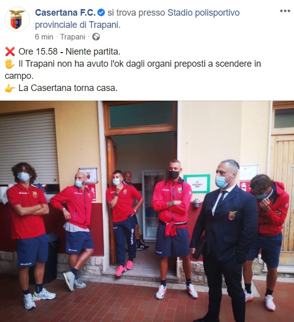 Si doveva giocare alle ore 15 la partita Trapani-Casertana. Il match non si è giocato perchè "il Trapani non ha avuto l'ok dagli organi preposti a scendere in campo". A questo punto, si profilerebbe lo 0-3 a tavolino per i Falchetti ma si aspetta l'ufficializzazione della Lega. Nel frattempo i Falchetti lasceranno Trapani appena possibile.