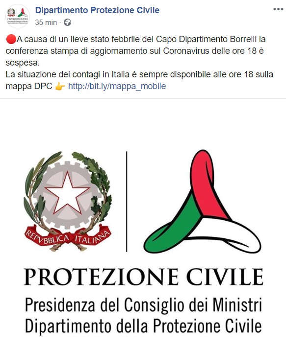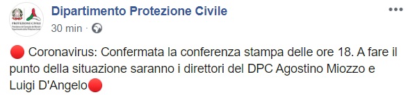 Lo apprendiamo dalla pagina facebook del Dipartimento Prot. Civile: