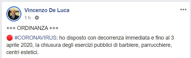 Ore 15. Pres. De Luca: "Chiusi barbieri, parrucchieri e centri estetici. I centri di riabilitazione invece..."