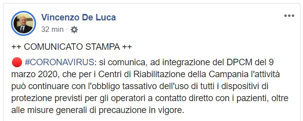 Questo quanto comunicato dal Governatore De Luca