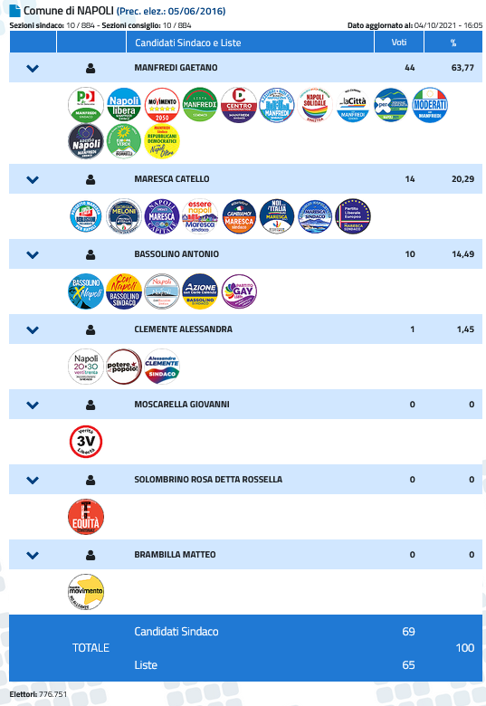 A Napoli primi numeri in arrivo dalle elezioni comunali. Infatti la situazione dopo 10 sezioni scrutinate è la seguente: Manfredi, al 63,77% dei voti, è seguito da Maresca al 20,29%. In terza posizione figura Bassolino, al 14,49%, frutto di 10 voti raccolti, mentre fuori dal podio Alessandra Clemente con l'1,45%. Moscarella, Solombrino e Brambilla sono fermi a zero.