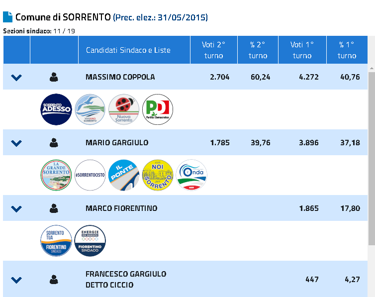 ORE 16:30. COMUNALI SORRENTO. 11 sez. scrutinate. Coppola sempre avanti. DATI MINISTERO