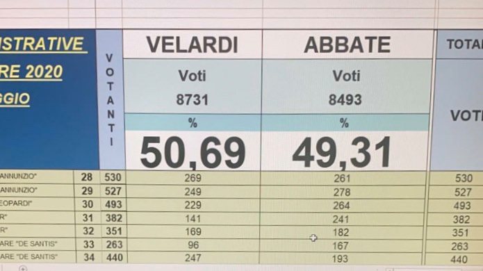 Mancano solo 3 sezioni da scrutinare e Velardi conserva 238 preferenze di vantaggio su Abbate.